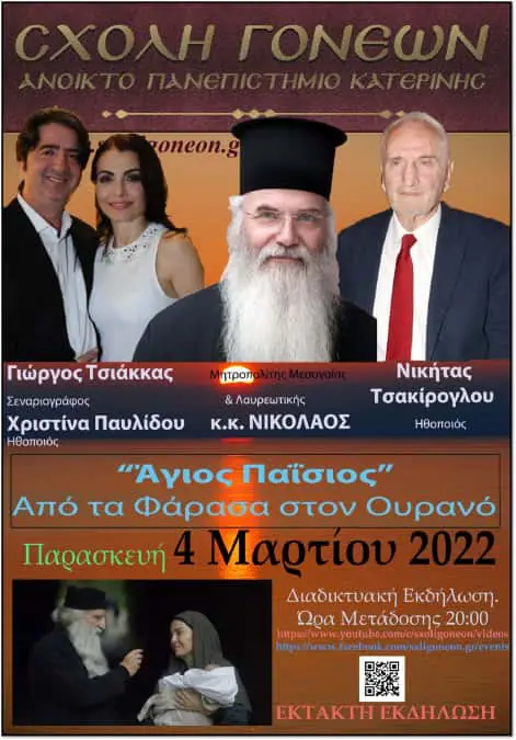 Αυτά και πολλά άλλα θα συζητήσουμε σε μία έκτακτη εκδήλωση της Σχολής Γονέων – Ανοικτό Πανεπιστήμιο Κατερίνης την Παρασκευή 4 Μαρτίου 2022 διαδικτυακά στις 20:00 με θέμα: “Άγιος Παίσιος. Από τα Φάρασα στον Ουρανό“ με καλεσμένους τον σεναριογράφο  και εμπνευστή αυτής της σειράς κ. Γιώργο Τσιάκκα, την πρωταγωνίστρια η οποία ενσαρκώνει την μητέρα του Αγίου Παϊσίου κ. Χριστίνα Παυλίδου και τον μεγάλο πρωταγωνιστή του Εθνικού μας Θεάτρου που ενσαρκώνει τον Άγιο Αρσένιο κ. Νικήτα Τσακίρογλου.