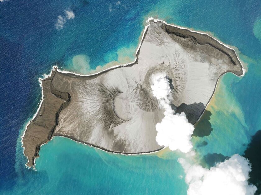 Από τη λάβα της έκρηξης του υποθαλάσσιου ηφαιστείου Χούνγκα Τόνγκα-Χούνγκα Χαπάι δημιουργήθηκε ένα νησί όπως φαίνεται στις δορυφορικές φωτογραφίες που ακολουθούν: