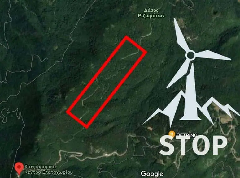 Μια ανάσα από το Χιονοδρομικό Κέντρο του Ελατοχωρίου και μέσα στην καρδιά του παρθένου δάσους των Ριζωμάτων (κόκκινο πλαίσιο) ετοιμάζονται να εγκαταστήσουν άλλες 7 ανεμογεννήτριες!