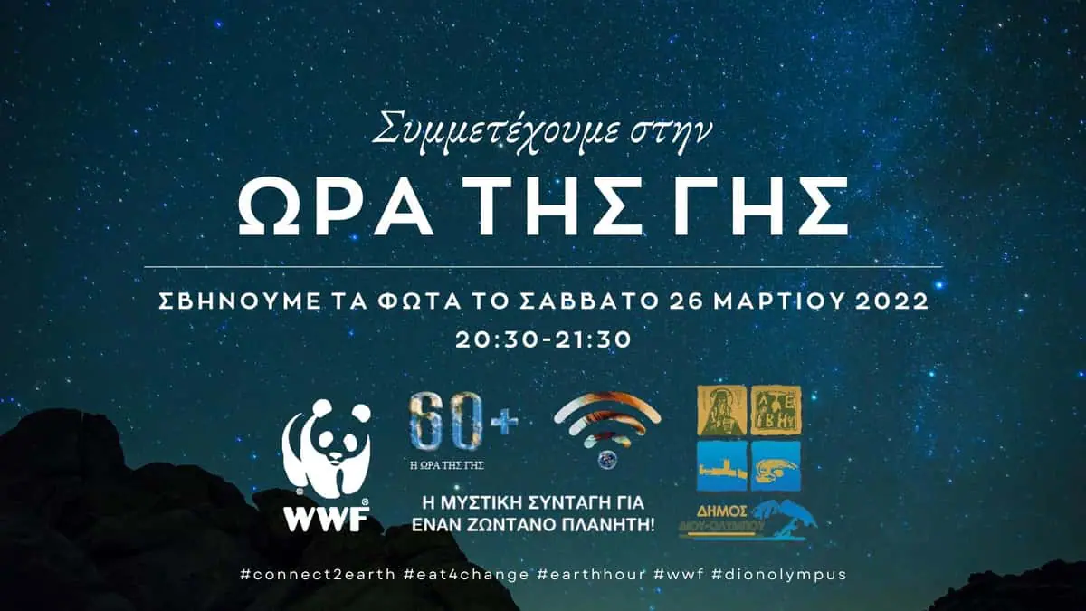 Και φέτος ο Δήμος Δίου-Ολύμπου συμμετέχει στην «Ώρα της Γης», τη διεθνή καμπάνια περιβαλλοντικής ευαισθητοποίησης των πολιτών κατά της κλιματικής αλλαγής του Παγκόσμιου Ταμείου για την Φύση (WWF).