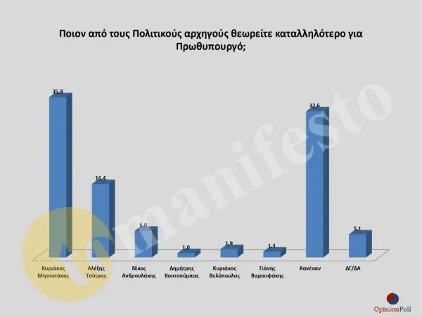 Σε ό,τι αφορά τη δημοφιλία των πολιτικών αρχηγών ο Κυριάκος Μητσοτάκης παραμένει πρώτος, ενώ προηγείται του Αλέξη Τσίπρα στην καταλληλότητα για την πρωθυπουργία με σχεδόν 20 μονάδες.