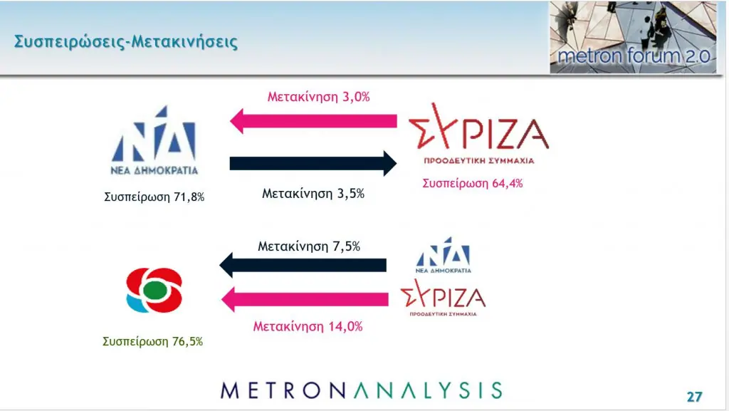 Αναφορικά με τις συσπειρώσεις – μετακινήσεις, η ΝΔ έχει συσπείρωση 71,8% με ένα 3% να μετακινείται από τον ΣΥΡΙΖΑ και ένα 3,5% να φεύγει προς την Κουμουνδούρου.