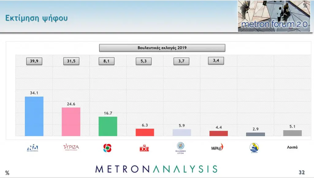- Η ΝΔ λαμβάνει ποσοστό 34,1% (39,9% στις εκλογές), ο ΣΥΡΙΖΑ 24,6% (31,5%), το Κίνημα Αλλαγής 16,7% (8,1%), το ΚΚΕ στο 6,3% (5,3%), η Ελληνική Λύση στο 5,9% (3,7%), το ΜΕΡΑ25 στο 4,4% (3,4%) και οι Ελληνες του Κασιδιάρη στο 2,9%.
