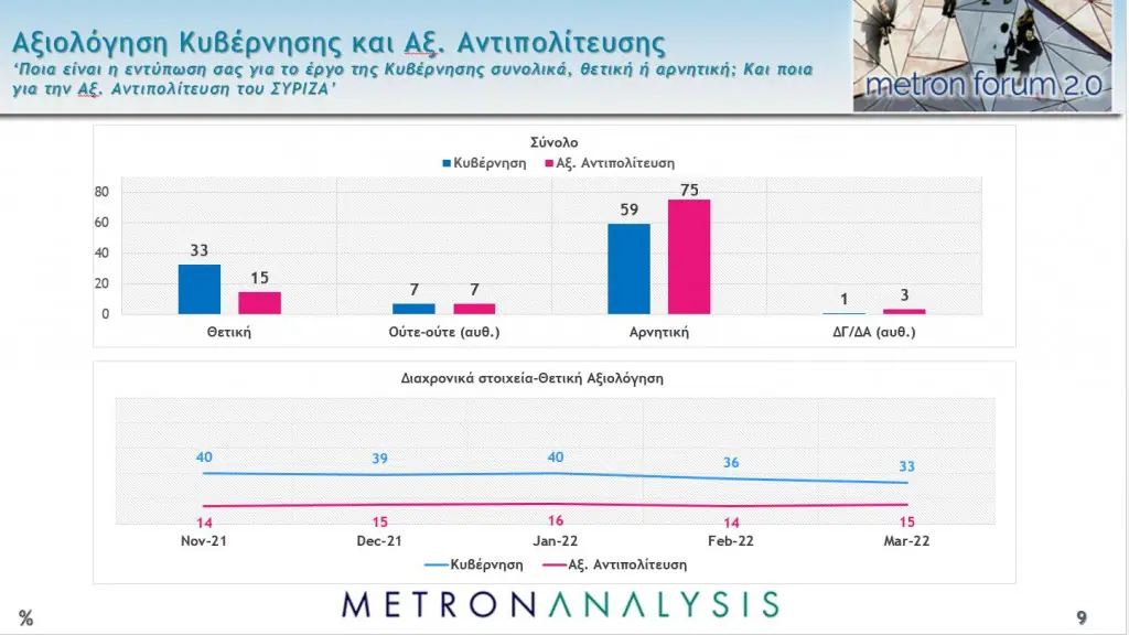 - Στην αξιολόγηση των πολιτών βλέπουμε ότι η κυβέρνηση έχει θετικές γνώμες σε ποσοστό 30% ως προς το γενικότερο έργο, ενώ το 59% % έχει αρνητική γνώμη. Κακή παραμένει η εικόνα για την αξιωματική αντιπολίτευση. Μόλις 15% κρίνει θετικά τον ΣΥΡΙΖΑ και 75% αρνητικά.