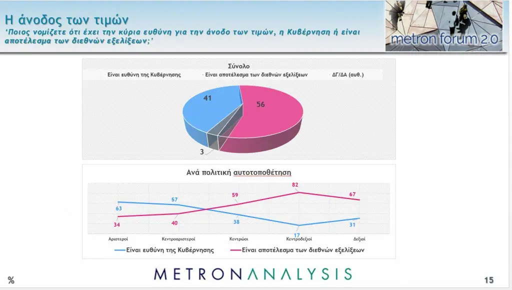 - Για την άνοδο των τιμών και την ακρίβεια, το 56% εκτιμά ότι είναι αποτέλεσμα των διεθνών εξελίξεων αλλά το 41% ότι είναι ευθύνη της κυβέρνησης.