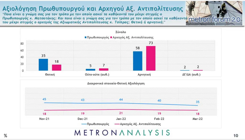 - Οι θετικές γνώμες για τον πρωθυπουργό είναι 35% και οι αρνητικές στο 58%. Για τον κ. Τσίπρα οι θετικές γνώμες είναι 18% και οι αρνητικές στο 73%.