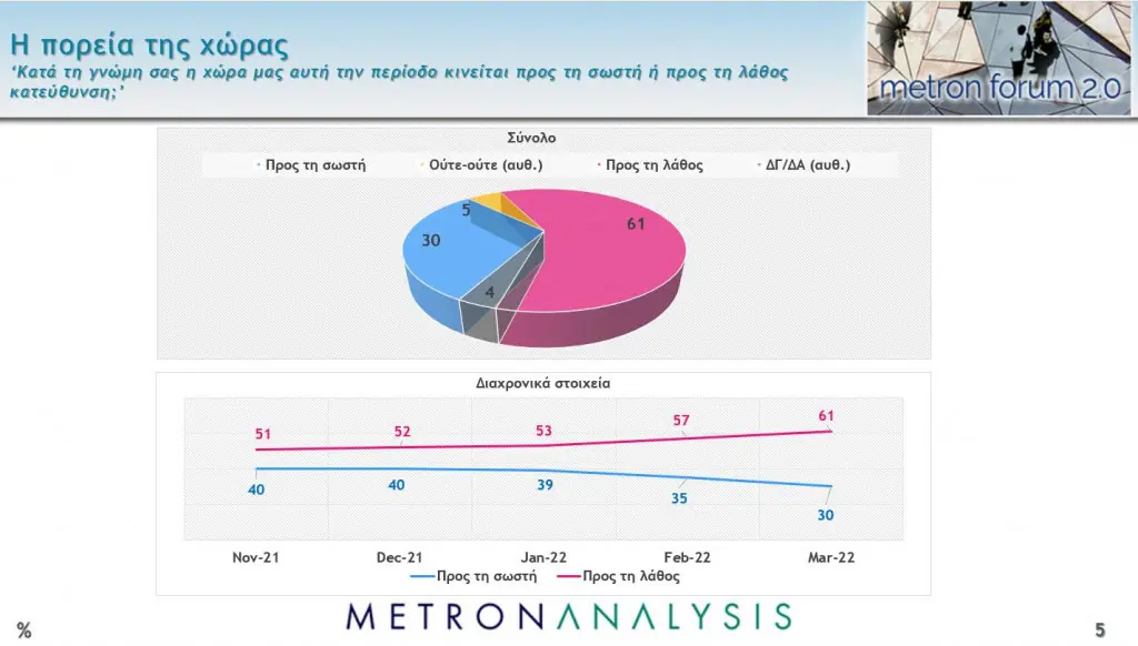 - Εξι στους 10 Ελληνες (61%) πιστεύουν ότι η χώρα αυτή την περίοδο κινείται προς τη λάθος κατεύθυνση και το 30% προς τη σωστή. Από το Νοέμβριο η τάση αυτή έχει αυξηθεί κατά 9 μονάδες (από 51 σε 60%).