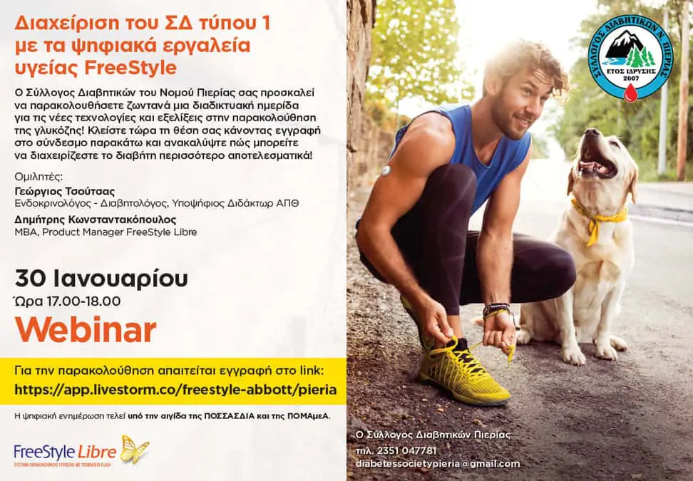 Ο Σύλλογος Διαβητικών Ν.Πιερίας προσκαλεί τα μέλη και τους φίλους του να παρακολουθήσουν ζωντανά μια διαδικτυακή ημερίδα για τις νέες τεχνολογίες και εξελίξεις στην παρακολούθηση της γλυκόζης, με θέμα: «Διαχείριση του σακχαρώδους διαβήτη-1 με τα ψηφιακά εργαλεία υγείας ‘‘Free Style”».