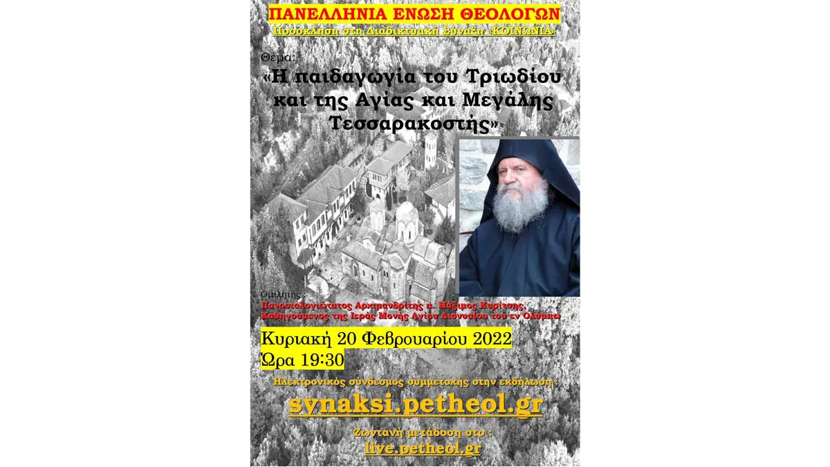 Διαδικτυακή Σύναξη «ΚΟΙΝΩΝΙΑ» της Πανελλήνιας Ένωσης Θεολόγων(ΠΕΘ) με ομιλητή τον Καθηγούμενο της Ιεράς Μονής Αγίου Διονυσίου του εν Ολύμπω, π. Μάξιμο Κυρίτση