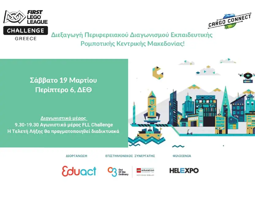 Το Σάββατο 19 Μαρτίου 2022, θα διεξαχθεί στην Θεσσαλονίκη ο Περιφερειακός Διαγωνισμός Κεντρικής Μακεδονίας του FIRST® LEGO® League για τις ομάδες της Κεντρικής Μακεδονίας από τον Εκπαιδευτικό Οργανισμό Eduact. Η ΔΕΘ – HELEXPO Α.Ε αποτελεί χορηγό φιλοξενίας της διοργάνωσης και η εκδήλωση θα πραγματοποιηθεί στο Περίπτερο 6.