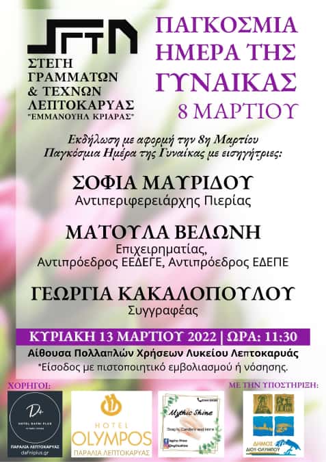 την Κυριακή 13 Μαρτίου 2022 στις 11:30 στην Αίθουσα Πολλαπλών Χρήσεων του Λυκείου Λεπτοκαρυάς.