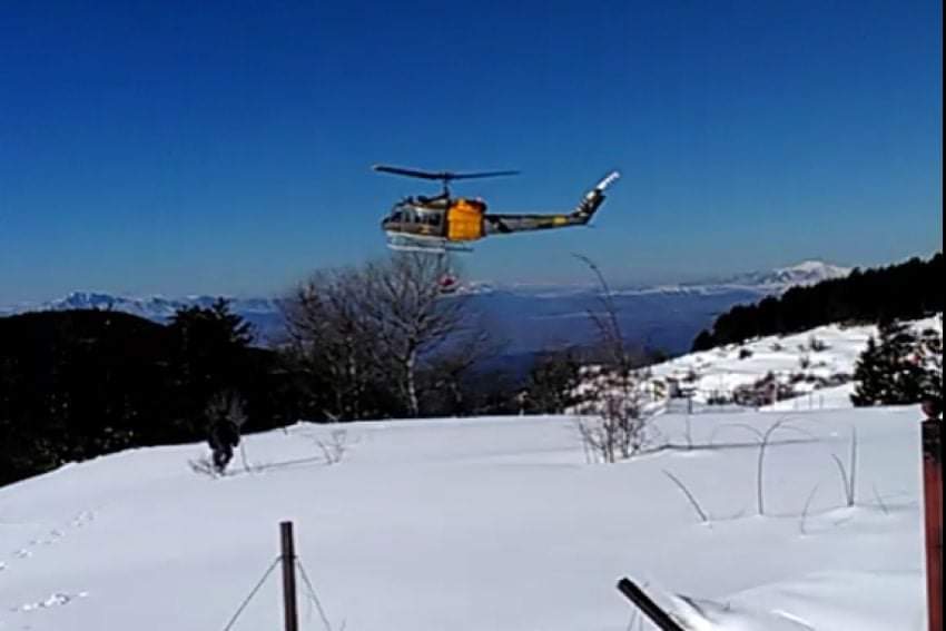 Στις 10.30 περίπου χθες προσγειώθηκε το ελικόπτερο στο Καταφύγι του Δήμου Βελβεντού για να παραλάβει τους τέσσερις εγκλωβισμένους κατοίκους του χωριού.