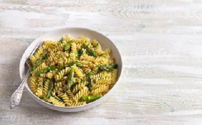 Σουρώστε και τοποθετήστε τα ζυμαρικά με τα σπαράγγια σε ένα μεγάλο μπολ.