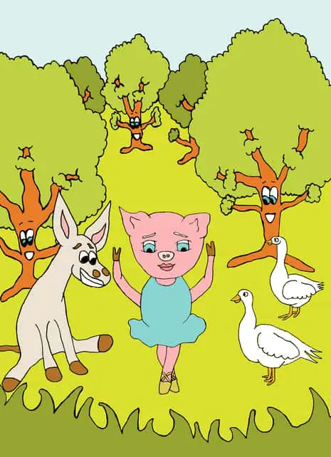 Η τρυφερή ιστορία πραγματεύεται τις φιλότιμες προσπάθειες που καταβάλει η Ρινίτσα, η μικρή γουρουνίτσα που ζει σε φάρμα, προκειμένου να αγγίξει έστω για λίγο το όνειρο της…να σταθεί στις μύτες των δυο ποδιών της και να χορέψει.