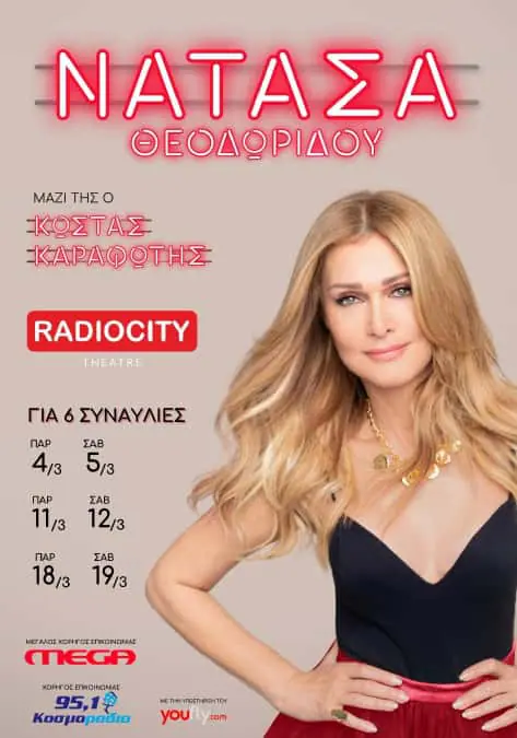 Το RADIO CITY Theater, ανακαινίστηκε πλήρως και ανοίγει ξανά τις πόρτες του, για να υποδεχθεί τη δική μας Νατάσα, μετά την σαρωτική επιτυχία των εμφανίσεών της στην Αθήνα, που ξεπέρασαν τους 20.000 θεατές. Η Νατάσα Θεοδωρίδου ανεβαίνει στη πόλη της για 6 συναυλίες, κάθε Παρασκευή και Σάββατο από 4 έως και 19 Μαρτίου.