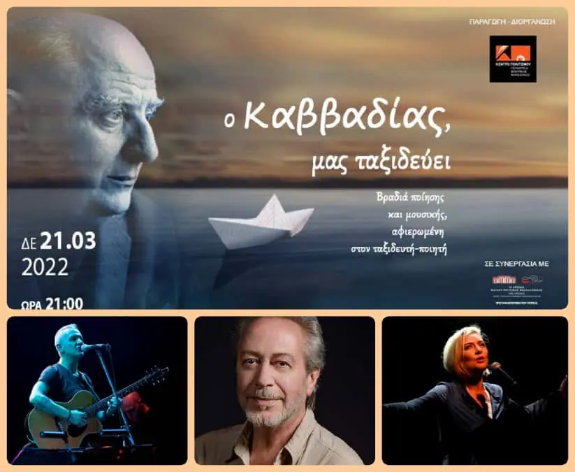 Το Κέντρο Πολιτισμού Περιφέρειας Κεντρικής Μακεδονίας παρουσιάζει την μεγάλη επιτυχία του Φεστιβάλ Επταπυργίου 2021 «Ο Καββαδίας, μας ταξιδεύει», την Δευτέρα 21 Μαρτίου και ώρα 21.00 στο Μέγαρο Μουσικής Θεσσαλονίκης (αίθουσα φίλων μουσικής Μ1) , με αφορμή την παγκόσμια ημέρα ποίησης, στις 21 Μαρτίου.