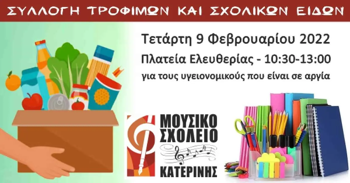 Την Τετάρτη 9 Φεβρουαρίου 2022 το Μουσικό Σχολείο Κατερίνης θα βρίσκεται στην πλατεία Ελευθερίας από τις 10:30 έως και τις 13:00 συλλέγοντας τρόφιμα μακράς διάρκειας και σχολικά είδη ως ελάχιστη ένδειξη αλληλεγγύης στους συμπολίτες μας υγειονομικούς υπαλλήλους, που βρίσκονται σε αργία.