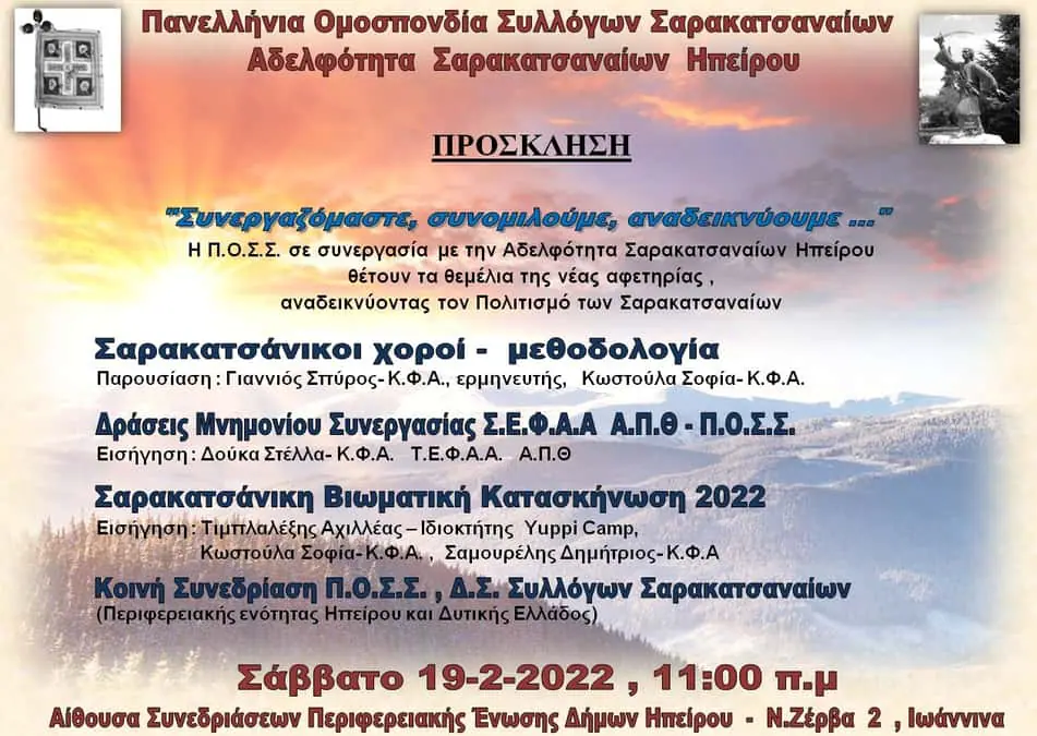 Το Σάββατο 19-2-2022 στην Συνεδριακή  αίθουσα της Περιφερειακής Ένωσης Δήμου Ιωαννιτών  στην  Ναπολέοντος Ζέρβα 2 στις 11.00 π.μ. θα πραγματοποιηθεί η συνάντηση με το ακόλουθο πρόγραμμα :
