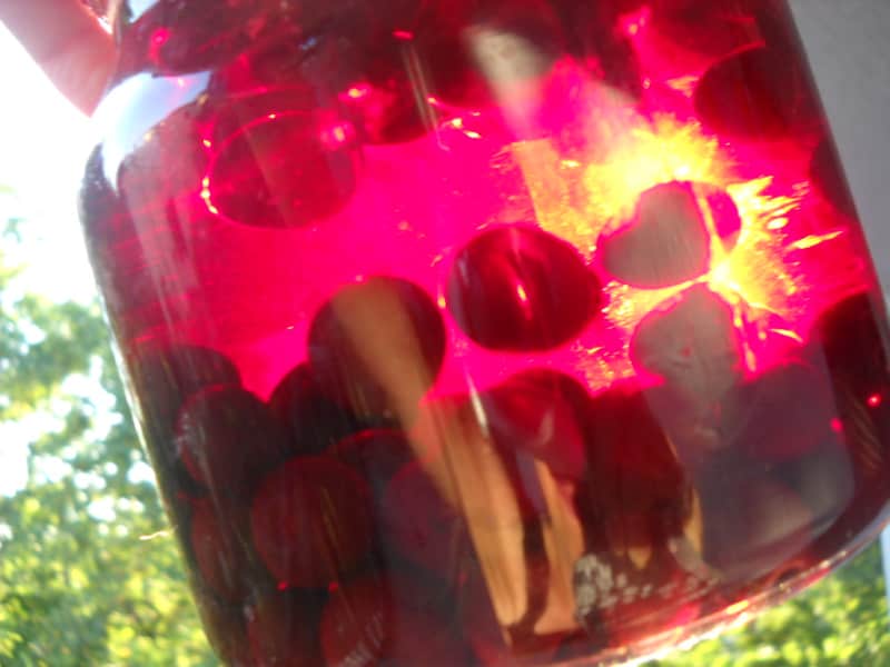 Ξανακλείνουμε ερμητικά, ανακινούμε καλά για να ανακατευθεί και να ενωθεί με το υγρό που έχουν βγάλει τα βύσσινα και η ζάχαρη, και το αφήνουμε για άλλον 1 μήνα. Και εδώ η προφύλαξη με τη μεμβράνη, που κλείνει το καπάκι αεροστεγώς, βοηθάει να μην εξατμισθεί το αλκοόλ.