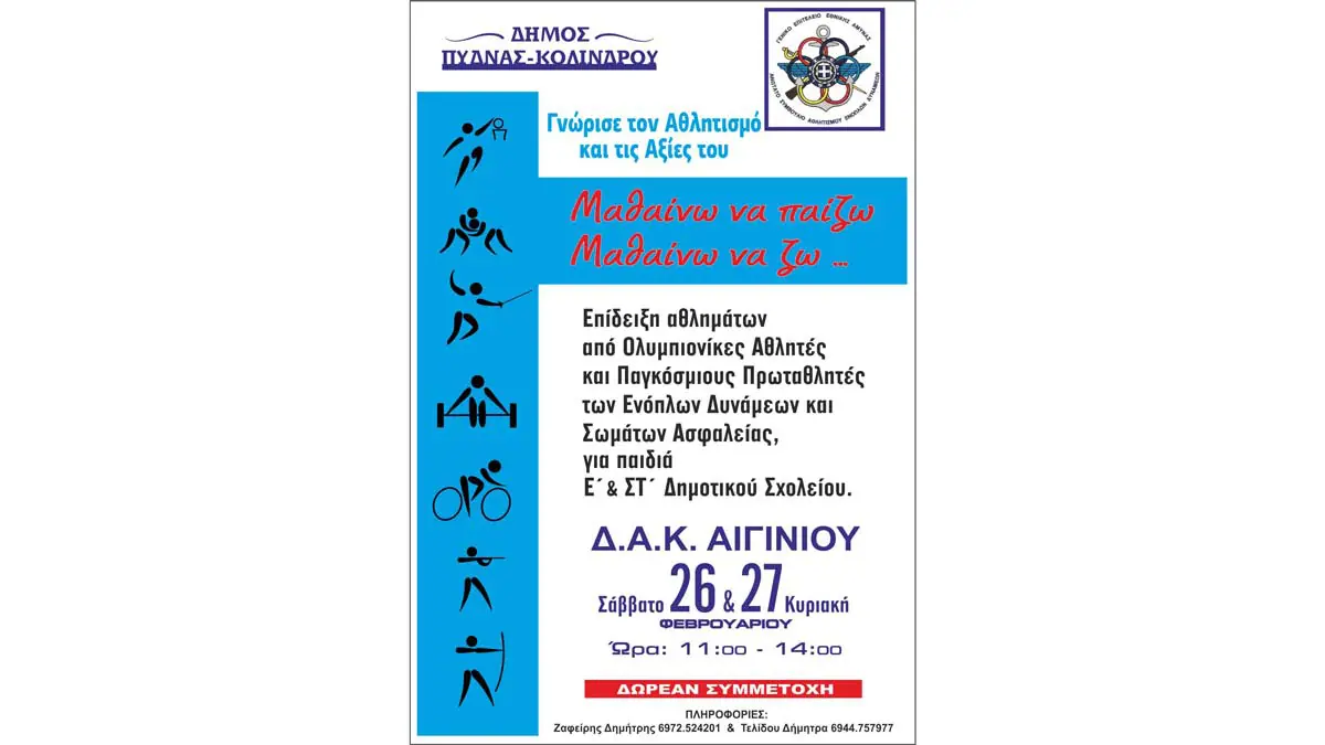 Στο πλαίσιο διοργανώσεως αθλητικών δρωμένων από το δήμο Πύδνας-Κολινδρού, το Σαββατοκύριακο 26-27 Φεβρουαρίου 2022 θα πραγματοποιηθεί στο Δ.Α.Κ. Αιγινίου και σε συνεργασία με το ΓΕΕΘΑ/ΑΣΑΕΔ και την ΕΘΝΟΑ η δραστηριότητα “Μαθαίνω να παίζω – Μαθαίνω να ζω”.