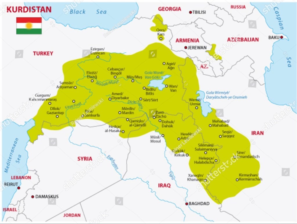 Ο παραπάνω χάρτης απεικονίζει τη γεωγραφική αποτύπωση ενός πιθανού μελλοντικού Κουρδιστάν. Ιδιαίτερη προσοχή πρέπει να αποδοθεί οπτικώς στα σημερινά κράτη στα οποία ‘‘επικάθεται’’ η πιθανή μελλοντική κουρδική κρατική επικράτεια και στο γεγονός ότι ενδέχεται ένα μελλοντικό κουρδικό κράτος να ‘‘βρέχεται’’ από τη Μεσόγειο Θάλασσα.