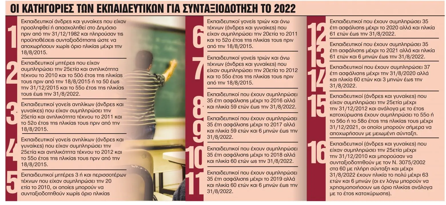 Στην κατηγορία των προς συνταξιοδότηση εκπαιδευτικών ανήκουν όλοι οι εκπαιδευτικοί πρωτοβάθμιας και δευτεροβάθμιας εκπαίδευσης που έχουν θεμελιωμένα δικαιώματα έως την 31/12/2021 και επιθυμούν να αποχωρήσουν από την ενεργό υπηρεσία στις 31/8/2022. Με υποβολή αίτησης τον Φεβρουάριο μπορούν να αποχωρήσουν εφέτος οι εκπαιδευτικοί που είχαν θεμελιωμένο δικαίωμα και είτε είχαν συμπληρώσει το αντίστοιχο όριο ηλικίας πριν από τον Αύγουστο του 2015 είτε συμπληρώνουν τα αυξημένα όρια μέχρι 31/8/2022.