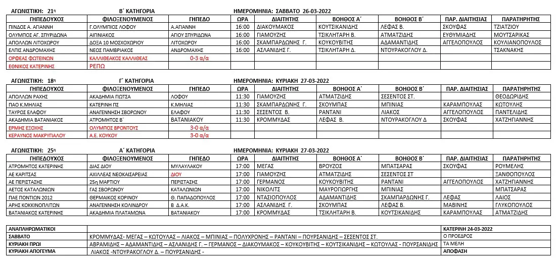Στην Νέα Έφεσο και στα γραφεία της Ε.Π.Σ. Πιερίας σήμερα 24-03-2022 ημέρα Πέμπτη και ώρα 15:00 συνήλθε σε συνεδρίαση η Επιτροπή Διαιτησίας της Ε.Π.Σ. Πιερίας που αποτελείται από τους Ευθυμιάδη Δαμιανό Πρόεδρο, Λέφα Γρηγόριο Αναπληρωτή Πρόεδρο και Σκούφα Σπυρίδωνα μέλος, με θέμα τον ορισμό διαιτητών και βοηθών διαιτητού για τους αγώνες Πρωταθλήματος της Ε.Π.Σ. Πιερίας που θα πραγματοποιηθούν την 26 & 27-03-2022. Μετά από διαλογική συζήτηση αποφασίσθηκε ομόφωνα ο ορισμός των διαιτητών και βοηθών διαιτητού όπως αναγράφεται παρακάτω.