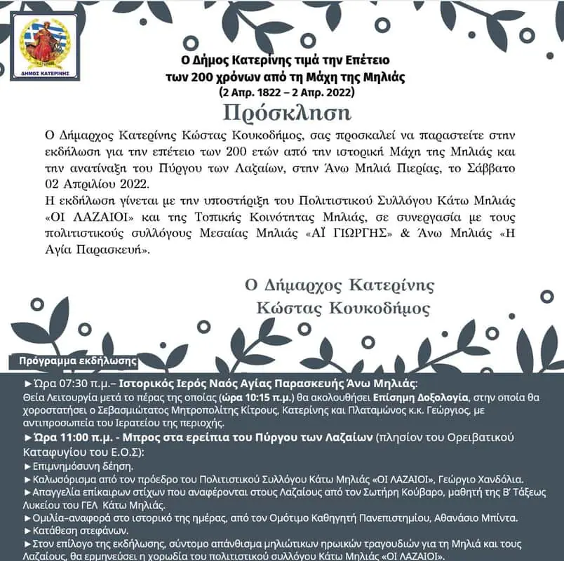 Ο Δήμος Κατερίνης τιμά την Επέτειο των 200 χρόνων από τη Μάχη της Μηλιάς (2 Απρ. 1822 – 2 Απρ. 2022)
