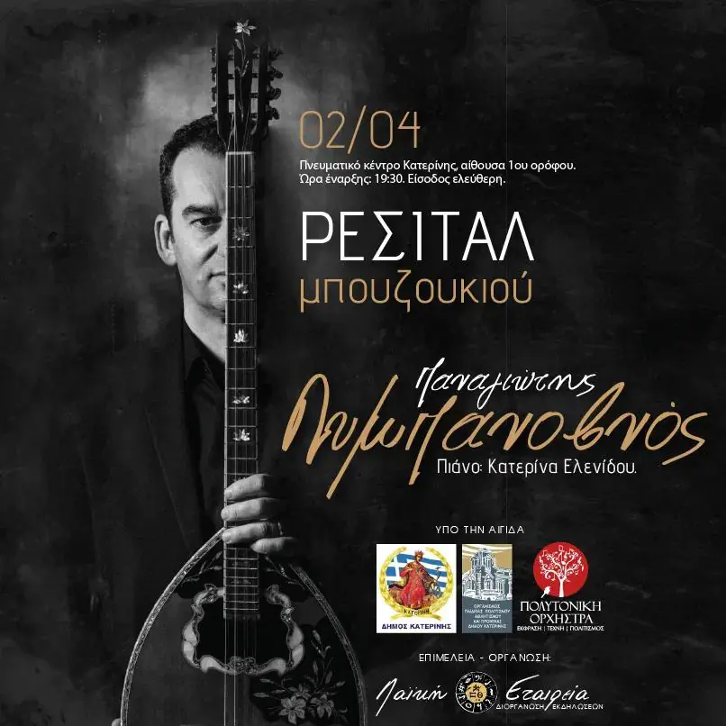 Για πρώτη φορά στην Κατερίνη, ένα μουσικό ταξίδι – ρεσιτάλ, με «όχημα» τον ήχο του μπουζουκιού του Παναγιώτη Λυμπανοβνού, σε σημαντικές εκτελέσεις έργων σπουδαίων σολίστ του μπουζουκιού, θα απολαύσουν οι φίλοι της μουσικής, το Σάββατο 02 Απριλίου και ώρα 19:30, στο Πνευματικό Κέντρο του Δ. Κατερίνης (αίθουσα Α’ ορόφου).