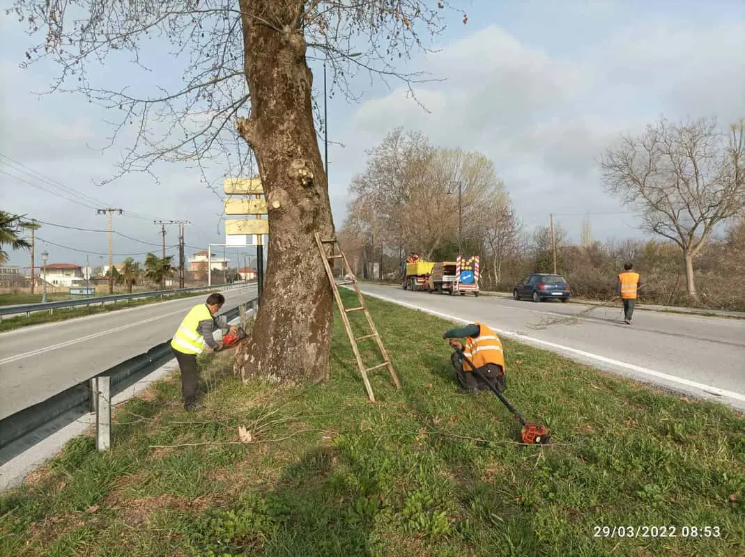 β) κλάδευση δέντρων στην 1ηΕπ.Οδό (Κατερίνη-Παραλία) απομακρύνοντας κλαδιά που ήταν επικίνδυνα και εμπόδιζαν την ορατότητα και την διέλευση οχημάτων και πεζών, καθώς και καλλωπισμό των φοινικόδεντρων στην νησίδα.