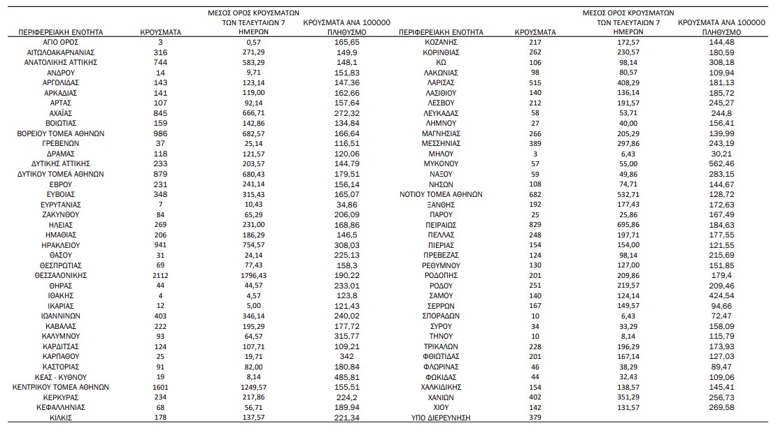 Ημερήσιος αριθμός και κρούσματα ανά 100.000 πληθυσμού επιβεβαιωμένων εγχώριων κρουσμάτων COVID-19 ανά περιφερειακή