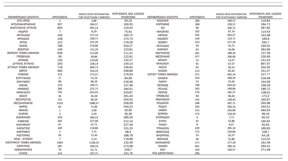 Ημερήσιος αριθμός και κρούσματα ανά 100.000 πληθυσμού επιβεβαιωμένων εγχώριων κρουσμάτων COVID-19 ανά περιφερειακή