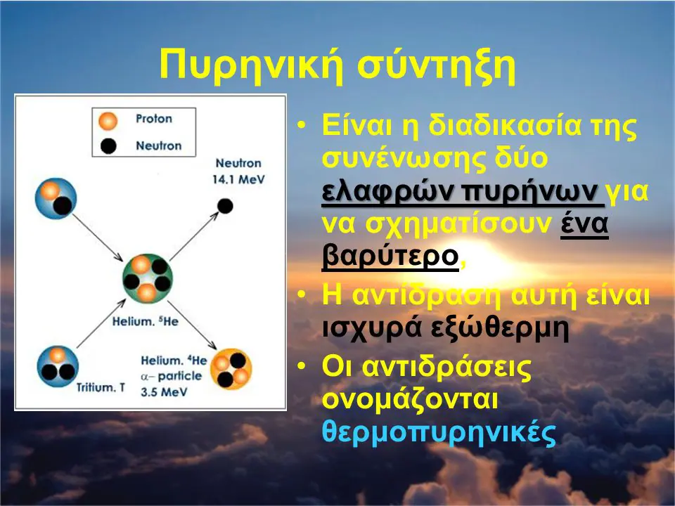 Η πυρηνική σύντηξη, ουσιαστικά το αντίθετο της πυρηνικής σχάσης, είναι η αντίδραση που τροφοδοτεί με ενέργεια τα άστρα και τις θερμοπυρηνικές βόμβες. Κάτω από συνθήκες ακραίας θερμοκρασίας και πίεσης, άτομα υδρογόνου ενώνονται, σχηματίζουν άτομα ήλιου και απελευθερώνουν μεγάλα ποσά ενέργειας.