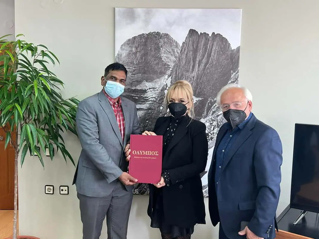 Την Κυριακή 27 Μαρτίου η Αντιπεριφερειάρχης Πιερίας, κα Σοφία Μαυρίδου, υποδέχθηκε στο γραφείο της στην έδρα της Π.Ε. Πιερίας, τον Γραμματέα της Πρεσβείας της Ινδίας, κ. S Rajendran, τον Πρόεδρο του Φεστιβάλ Ολύμπου, κ. Γρηγόρη Παπαχρήστο, τον Αντιπρόεδρο του ΟΡ.ΦΕ.Ο. κ. Οδυσσέα Μανωλόπουλο, τα μέλη του Δ.Σ. του Οργανισμού κα Λένα Γεωργούλη, κα Μελίνα Παπαδοπούλου, κ. Ραφαήλ Μετενίδη και κ. Βασίλειο Δήμου και τον διοικητικό διευθυντή κ. Νίκο Λακασά.