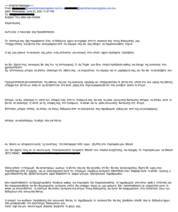 Στη συνέχεια, οι δράστες αναφέρουν ότι το κακόβουλο λογισμικό συνέλεξε όλες τις επαφές του χρήστη από τα μέσα κοινωνικής δικτύωσης και τον προσωπικό του λογαριασμό ηλεκτρονικού ταχυδρομείου, και με εκβιαστική τακτική απαιτούν από το θύμα να καταθέσει σε ψηφιακό πορτοφόλι, με την μορφή κρυπτονομίσματος, χρηματικό ποσό χιλίων ευρώ ή και μεγαλύτερο, εντός δύο εργάσιμων ημερών.