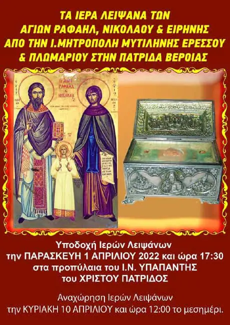 Την Παρασκευή 1 Απριλίου 2022 απόγευμα 17:30 στα προπύλαια του Ι.Ν. Υπαπαντής του Χριστού Πατρίδος Ημαθίας θα πραγματοποιηθεί η υποδοχή των Τιμίων και Χαριτόβρυτων λειψάνων νεοφανών μαρτύρων Ραφαήλ, Νικολάου και Ειρήνης από την Ι.Μ. Μυτιλήνης Πλωμαρίου & Ερεσσού.
