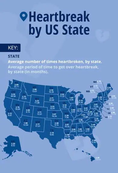 Για όσους έχουν νιώσει την καρδιά τους να ραγίζει και έχουν βιώσει την ψυχική και σωματική αναταραχή που συχνά τη συνοδεύει, δεν είστε μόνοι, καθώς η έρευνα του comparethemarket.com.au αποκαλύπτει ότι ο μέσος άνθρωπος έχει υποστεί αυτό περίππου 2,55 φορές στη ζωή του, και μετα από κάθε φορά που ραγίζει η καρδιά, χρειάζεται 13,48 μήνες για να ξεπεραστεί, που σημαίνει ότι ο μέσος ενήλικας έχει περάσει 2,86 χρόνια στη διαδικασία να ξεπεράσει τον χωρισμό!