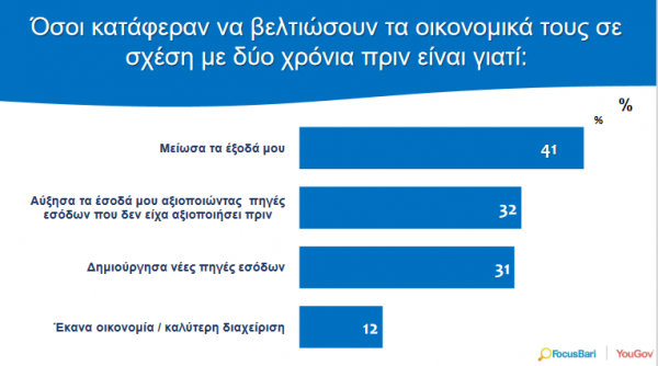 Πάντως η πλειονότητα όσων κατάφεραν να βελτιώσουν τα οικονομικά τους σε σχέση με δύο χρόνια πριν είναι γιατί μείωσαν τα έξοδά τους.