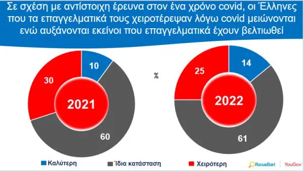 Μετά από δύο χρόνια πανδημίας, ένας στους δύο Έλληνες δηλώνουν ίδια κατάσταση ως προς τα οικονομικά τους, αλλά σχεδόν δύο στους πέντε δηλώνουν χειρότερη, σύμφωνα με τα αποτελέσματα νέας πανελλαδικής έρευνας της Focus Bari | YouGov.