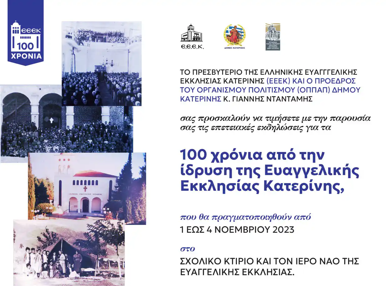 Επετειακές εκδηλώσεις για τα 100 χρόνια από την ίδρυση της Ελληνικής Ευαγγελικής Εκκλησίας Κατερίνης  υπό την αιγίδα του Ο.Π.Π.Α.Π του Δήμου Κατερίνης.