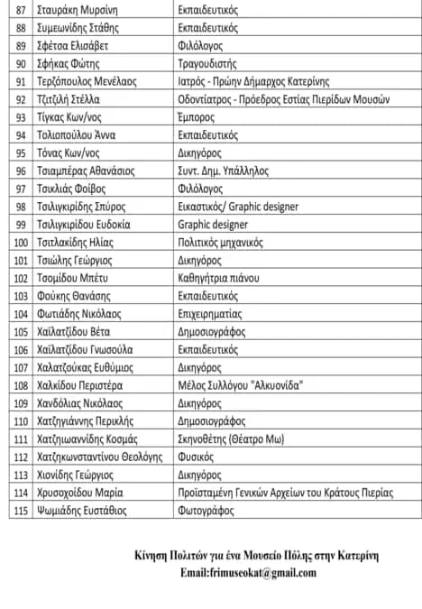 - Προτείνουμε την ίδρυση ενός Μουσείου της Πόλης της Κατερίνης, πολυσυλλεκτικού, δημοκρατικού, συμμετοχικού, με άξονα τις βιωμένες ιστορίες των κατοίκων της χωρίς αποκλεισμούς ή επιλεκτικές αφηγήσεις, όπως αποτυπώνονται στα υλικά τεκμήρια και τις προφορικές μαρτυρίες που θα συλλέγονται, θα ταξινομούνται, θα ερμηνεύονται και θα παρουσιάζονται προς όφελος των ανθρώπων που ζουν στην πόλη, της ιστορικής τους μνήμης και της υλικής και άυλης κληρονομιάς τους.