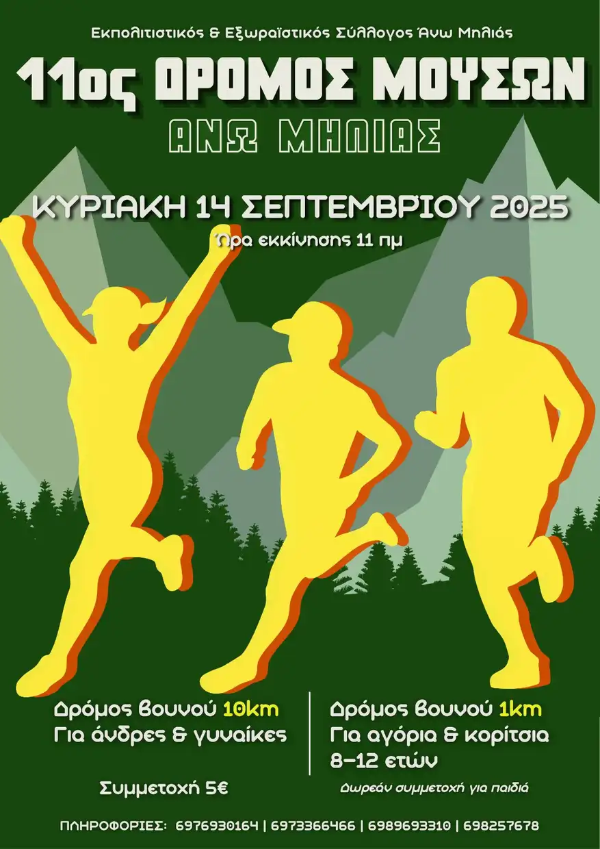 Ο 11ος Δρόμος Μουσών έρχεται την Κυριακή 14 Σεπτεμβρίου 2025 στην Άνω Μηλιά, από τον Εκπολιτιστικό & Εξωραϊστικό Σύλλογο Άνω Μηλιάς. Ένα ορεινό ραντεβού που ενώνει βουνό, δρομείς και φύση.