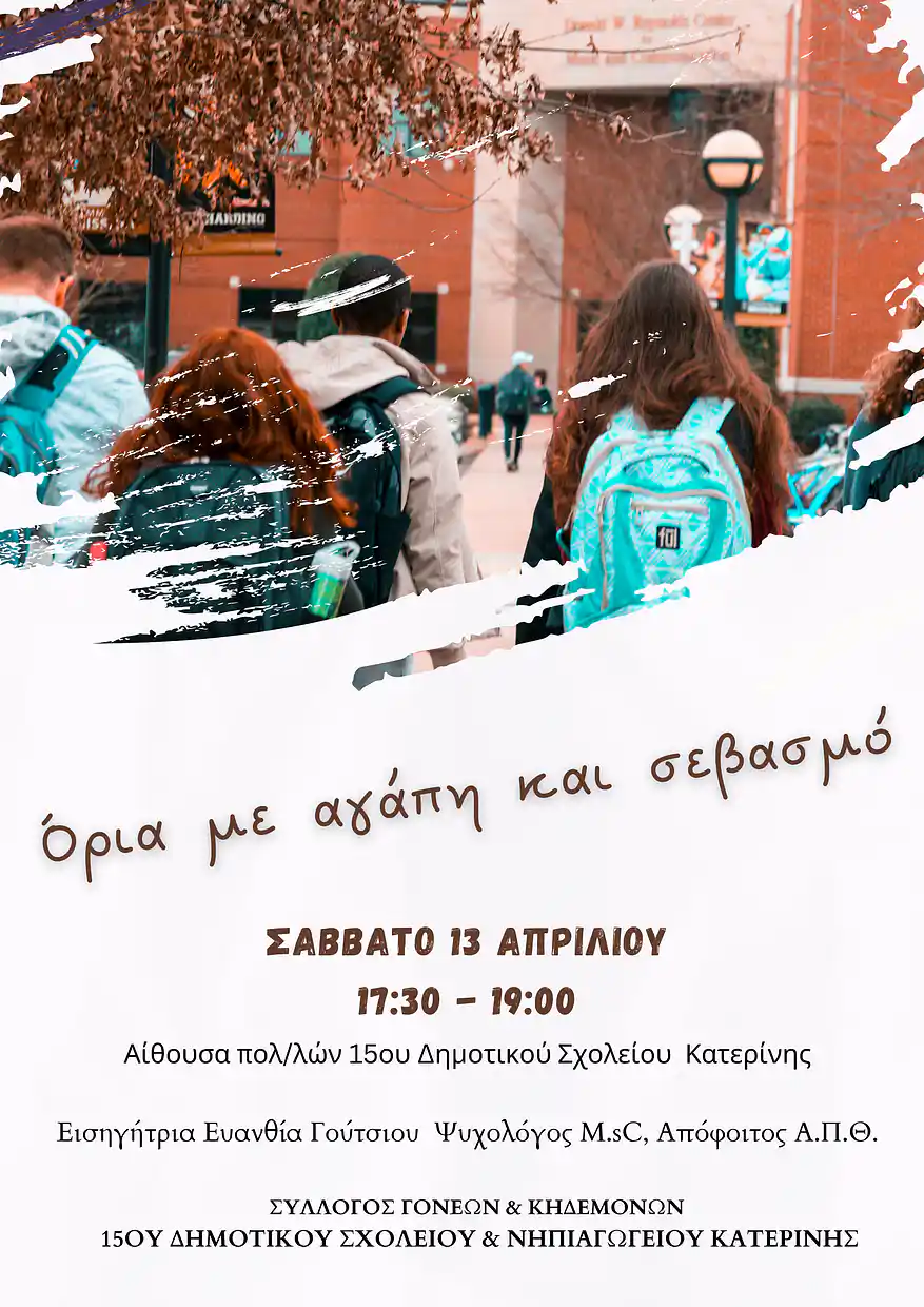 Ενημερωτική εσπερίδα του Συλλόγου Γονέων-Κηδεμόνων 15ου Δημοτικού και Νηπιαγωγείου Κατερίνης “Όρια με αγάπη και σεβασμό”