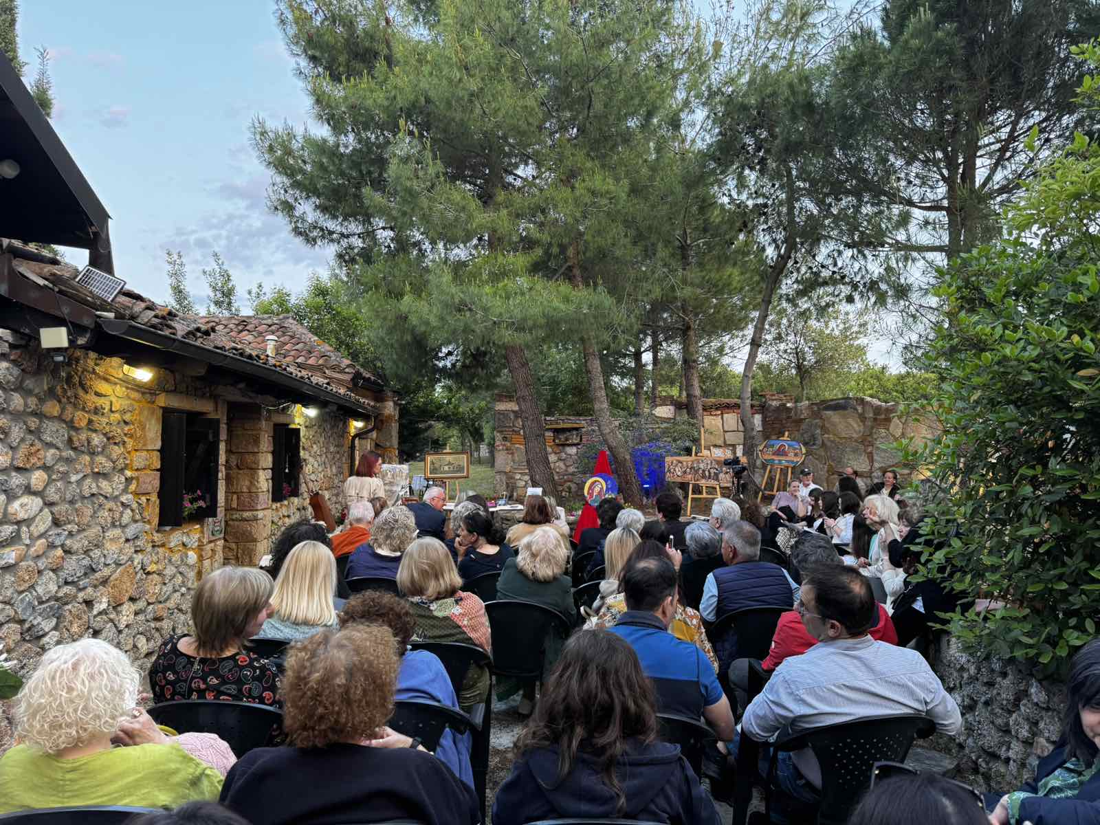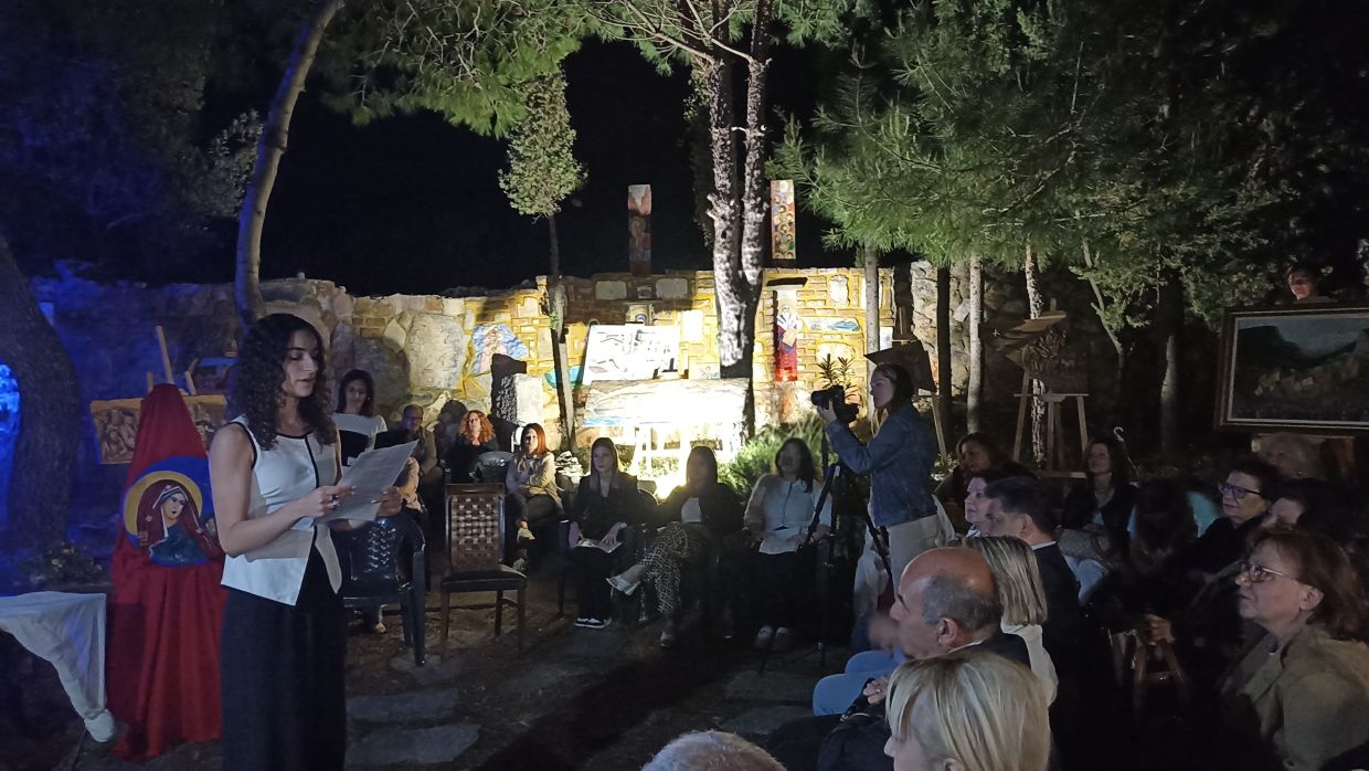 Αισθητική η οποία κυριαρχούσε στο χώρο, τα αδιόρατα βλέμματα των εικόνων, η φλόγα των κεριών, το καλοκαιρινό αεράκι του Ενιπέα, το φεγγάρι ανάμεσα από τα κυπαρίσσια, καρφιτσωμένο δίπλα από τις κορυφές του Ολύμπου, τα χρώματα των εικαστικών δημιουργιών, οι μουσικές νότες και ο λόγος. Οι λέξεις. Που διαπερνούσαν μέσα από τις απαγγελίες τη μνήμη, τις καρδιές, τα αισθήματα.