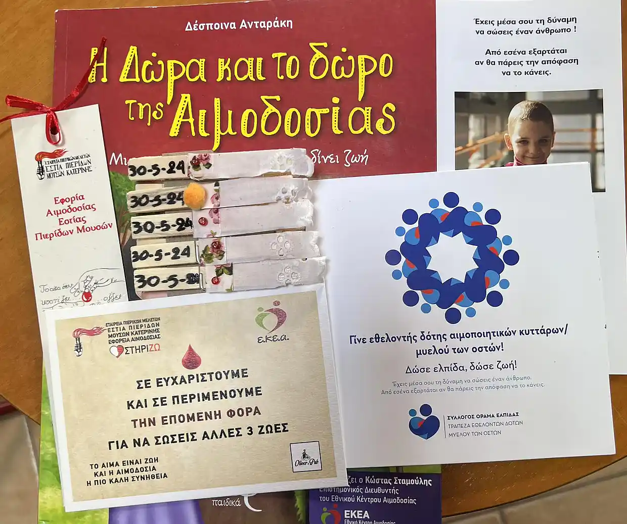 Βαθιά πεποίθηση της εφόρου αιμοδοσίας κας Κατερίνας Νταϊλάκη – Ιορδανίδου είναι ότι όλα ξεκινούν από την παιδεία. Για το λόγο αυτό επιδιώκουμε τη δημιουργία μιας κουλτούρας εθελοντισμού κι αλληλεγγύης, αναπτύσσοντας μια σειρά εκπαιδευτικών δράσεων για παιδιά, σε συνεργασία με την Α/θμια εκπαίδευση Πιερίας. Εξοικειώνονται έτσι τα παιδιά από νεαρή ηλικία με την έννοια του αίματος και καθιστούν την αλληλεγγύη ως τρόπο σκέψης και ζωής.