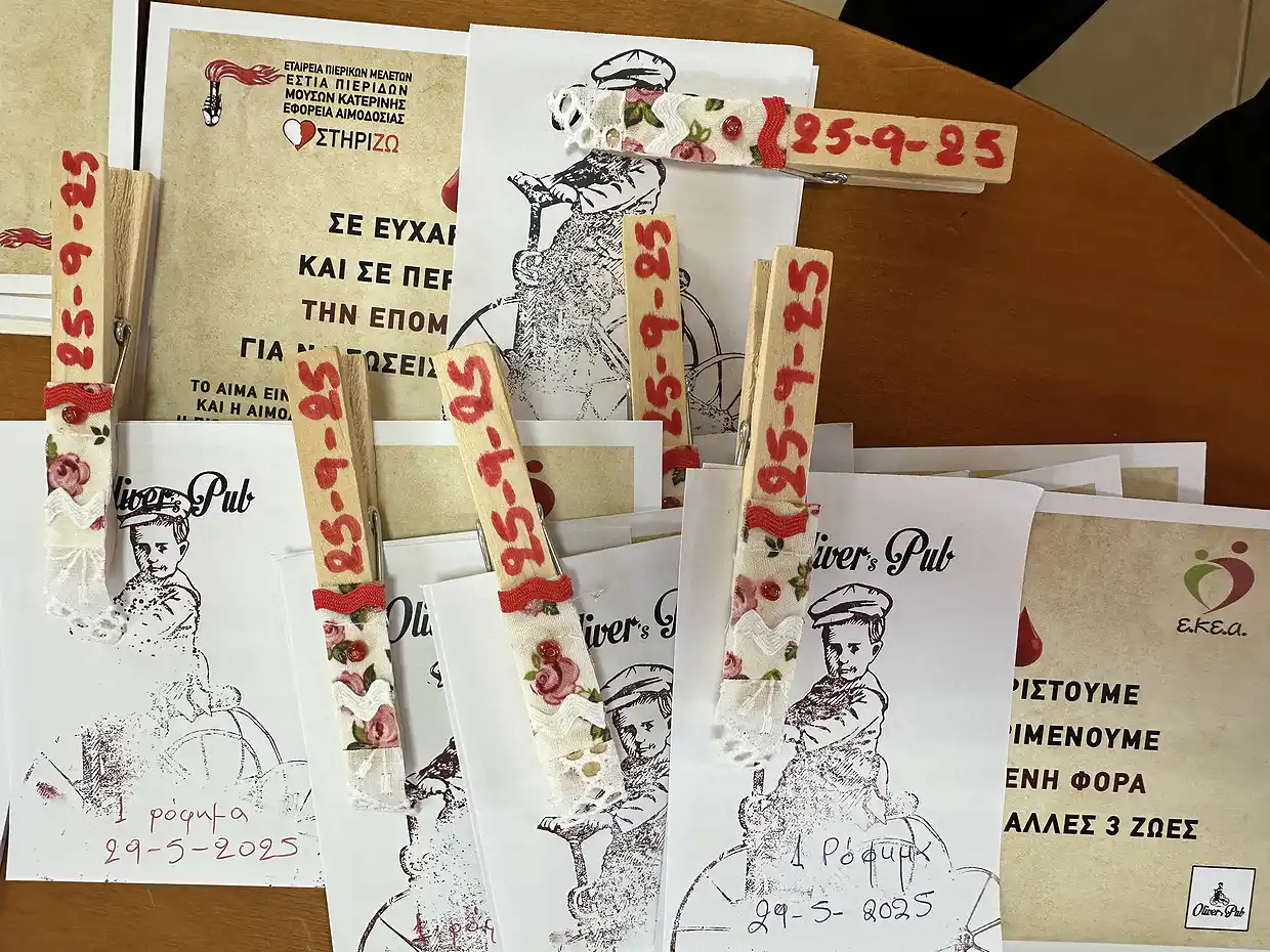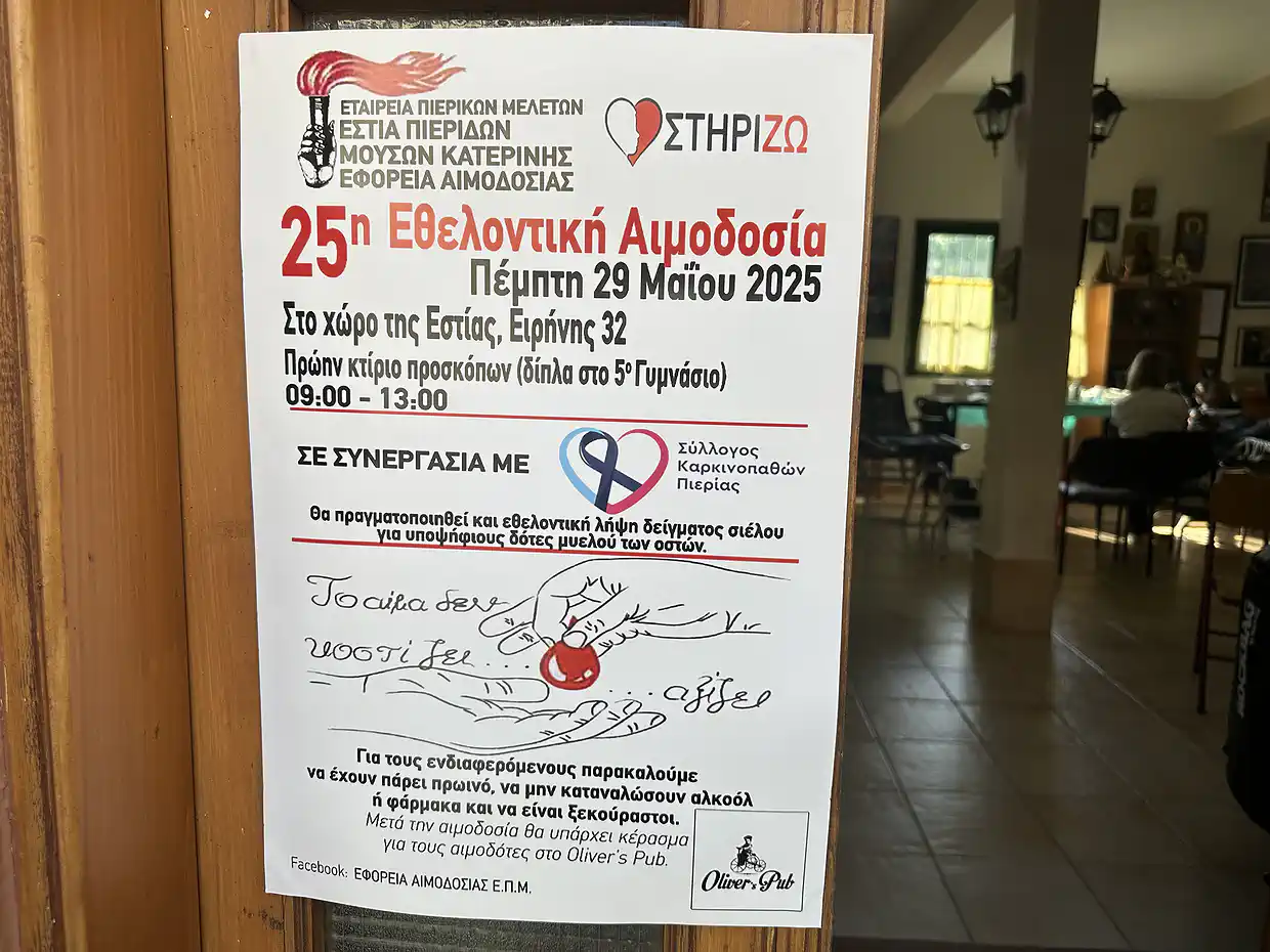 «Έχουμε την 25η Αιμοδοσία μας, στην Εστία Πιερίδων Μουσών σε συνεργασία με τον σύλλογο «ΣΤΗΡΙΖΩ». Μαζί μας είναι και ο Σύλλογος Καρκινοπαθών Πιερίας, που θα συγκεντρώσει δείγμα σιέλου από υποψήφιους δότες μυελού των οστών. Το πόσο σημαντικό είναι το να δίνουμε αίμα το έχουμε ακούσει πάρα πολλές φορές, καλό είναι να ευαισθητοποιηθούμε όλοι και να ανταποκριθούμε – σε όποια δράση μπορεί ο καθένας. Το αίμα που δίνουν οι αιμοδότες πηγαίνει σε δική τους καρτέλα, που διαχειρίζονται μόνοι τους. Εμείς απλά κάνουμε την διευκόλυνση σαν σύλλογος. Περιμένουμε να έρθετε, για να κάνετε τον κόσμο μας καλύτερο, να έχουμε επάρκεια σε αίμα και να ξεπεράσουμε προβλήματα τα οποία μπορούν να ξεπεραστούν, αφιερώνοντας δέκα λεπτά από το χρόνο μας»