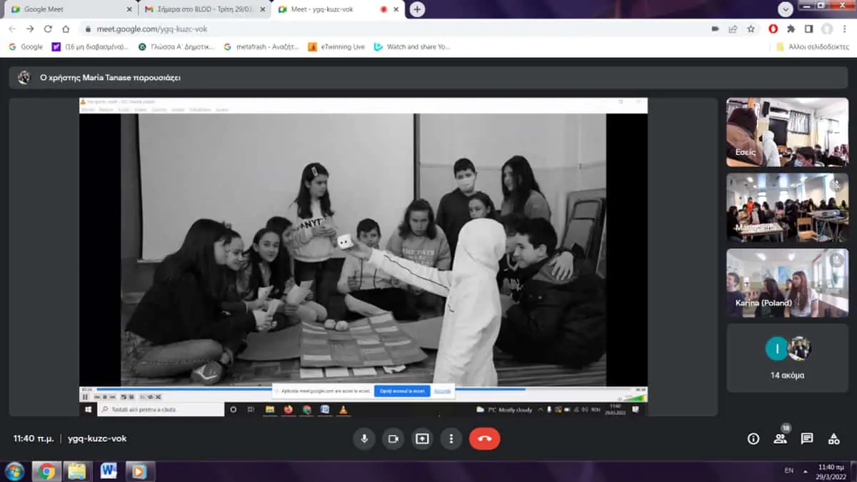 Όλοι οι εταίροι παρουσίασαν τις εργασίες που δημιούργησαν. Οι μαθητές μας παρουσίασαν το βίντεο που είχαν ετοιμάσει με το παιχνίδι ρόλων. Ήταν μία ιστορία που την σκέφτηκαν οι ίδιοι και την έκαναν επιτραπέζιο παιχνίδι υποκρινόμενοι τους ρόλους της μυθοπλασίας. Το τέλος του παιχνιδιού έγινε ύστερα από ψηφιακή ψηφοφορία μέσα από πλατφόρμα που δόθηκε στους συναδέλφους εταίρους.