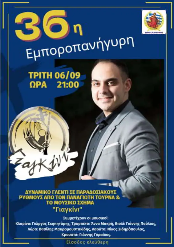 Αυθεντική ελληνική μουσική παράδοση από τον Παναγιώτη Τουρνά και το σχήμα «ΓΙΑΓΚΙΝΙ», μουσικό γλέντι με τα περίφημα «ΧΑΛΚΙΝΑ» Γουμένισσας & Θέατρο Σκιών, συνθέτουν το πρόγραμμα των επόμενων εκδηλώσεων, οι οποίες πλαισιώνουν την 36η Εμποροπανήγυρη του Δήμου Κατερίνης.