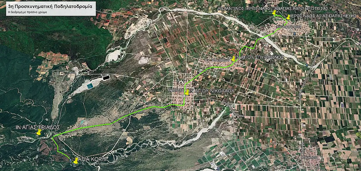 - Σημείο τερματισμού: Βυζαντινός Ιερός Ναός Κοίμησης της Θεοτόκου στην Κονταριώτισσα.