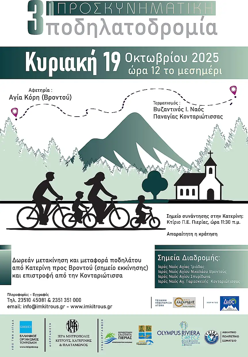 Την Κυριακή 19 Οκτωβρίου 2025 και ώρα 12 το μεσημέρι θα πραγματοποιηθεί η «3η ΠΡΟΣΚΥΝΗΜΑΤΙΚΗ ΠΟΔΗΛΑΤΟΔΡΟΜΙΑ»
